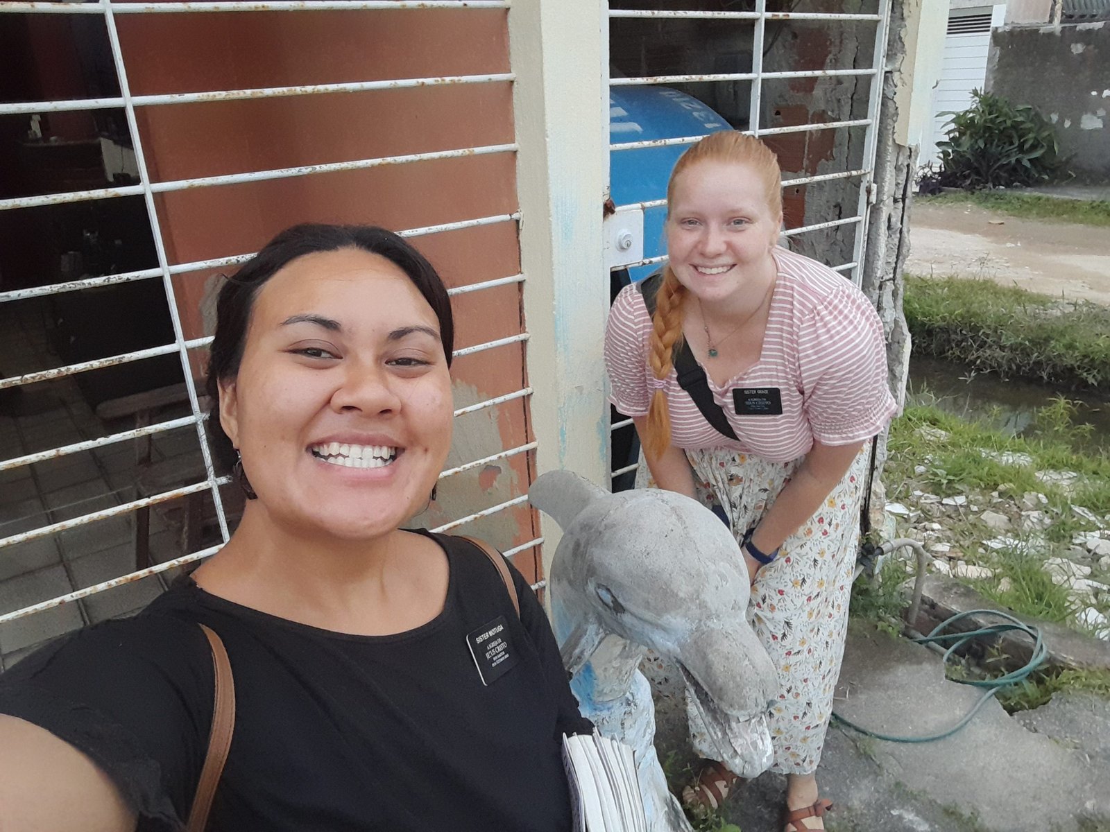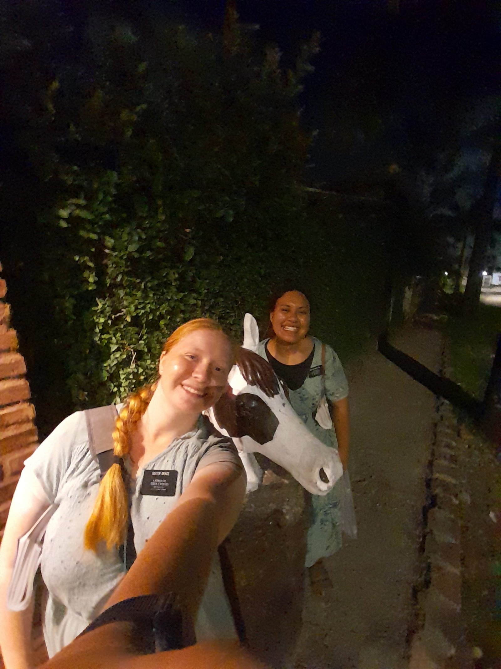A selfie of Alyssa and Sister Motuga with a horse statue