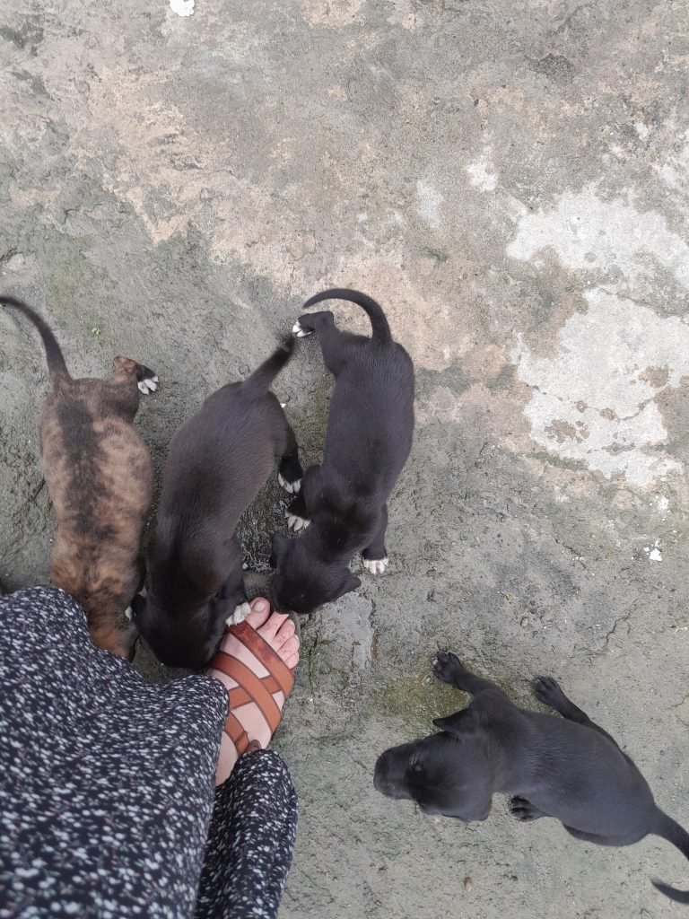 A group of puppies licks Alyssa’s feet