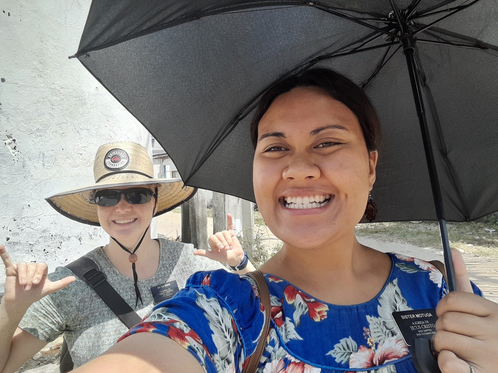 Alyssa and Sister Motuga outside under an umbrella